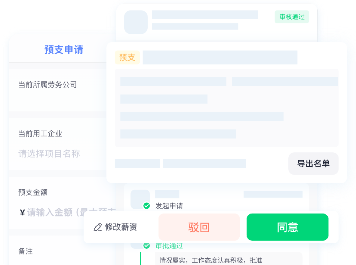 职工端线上提交薪资预支申请,企业管理员可在预支薪资页面批量审批,通过后自动进入后续流程。